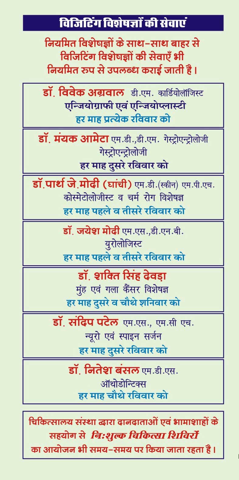 | 1 | Cardiology | Dr. Vivek Agarwal | D.M. Cardiologist Angiography and Angioplasty | Visit - Every Suturday & Sunday |